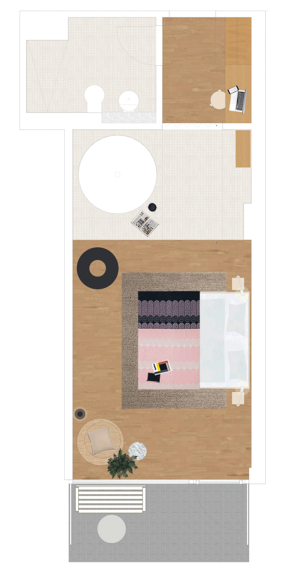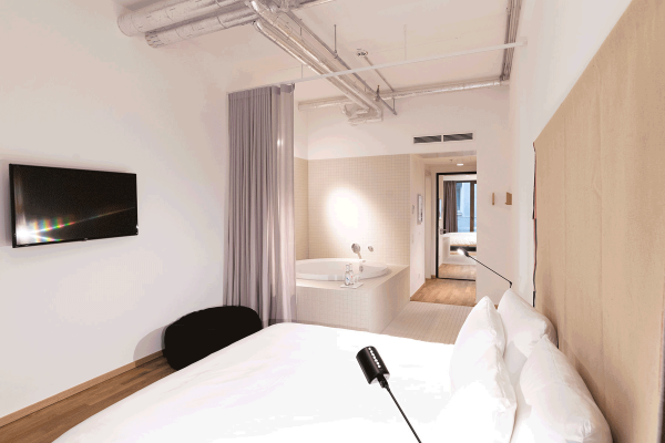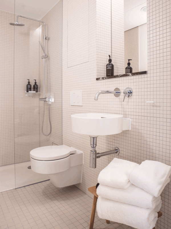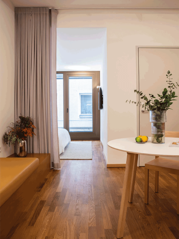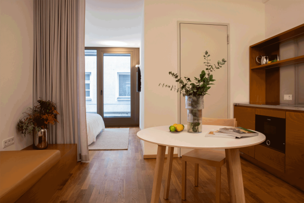 Window opens onto historic downtown Munich Functional and comfortable seating Smart TV with Apple TV and Android Connect